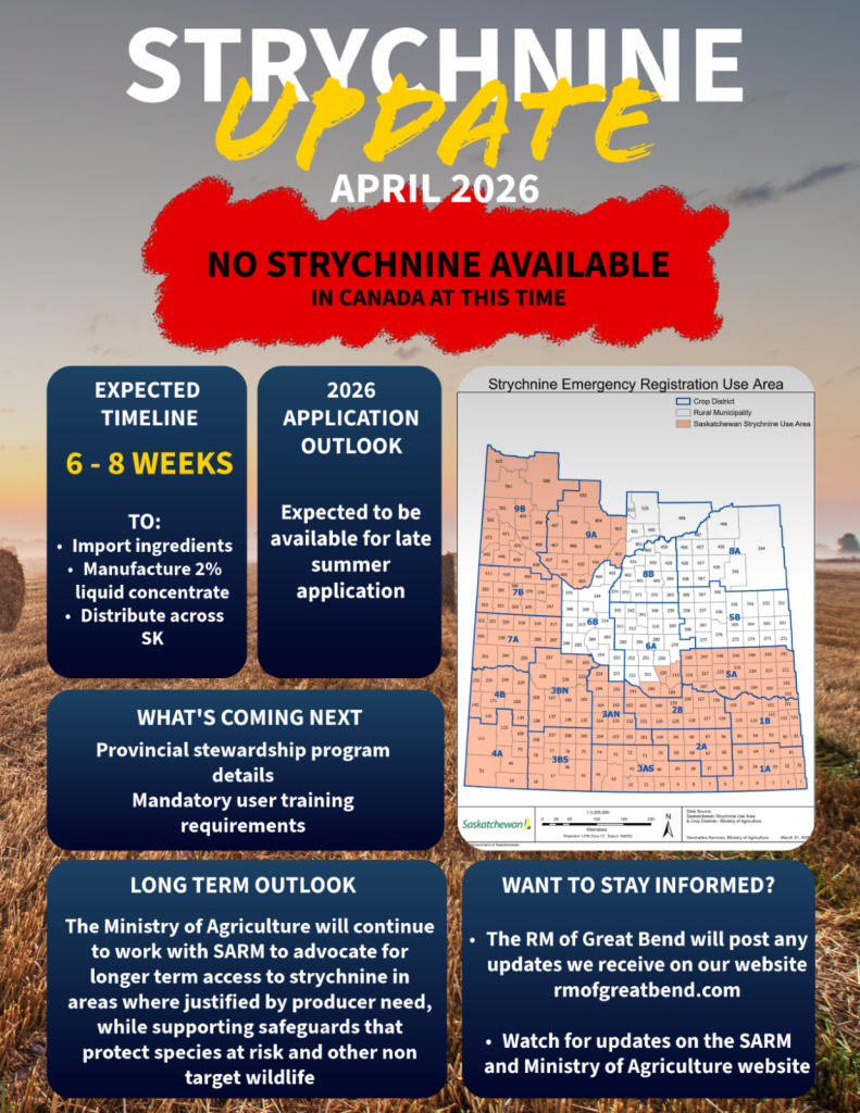 SARM will once again administer the Ground squirrel ((Richardson’s, Franklin’s, and thirteen-lined) and Northern pocket gopher) Control Program on behalf of the province, and will post updated guidelines soon. Rate payers can receive rebates of up 50% of their qualifying control costs. Receipts for gopher control products must be submitted to the RM office by July 31, 2026.